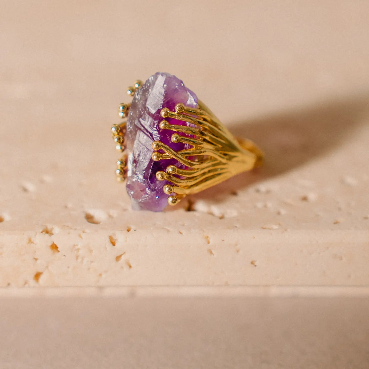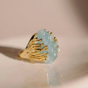 Set within a sculptural gold plated band, the design highlights the stone as the central element of the composition. The warm metal structure frames the cool mineral tones, creating contrast and balance.